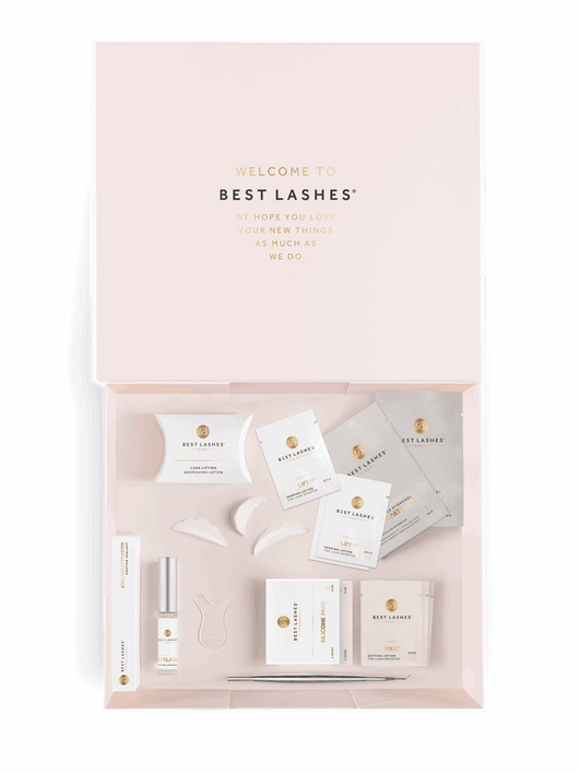 Our Mini Kit is shipped in a practical and aesthetically pleasing decorative box, and it includes the basic products, active ingredients and tools which are necessary for an eyelash lifting treatments.