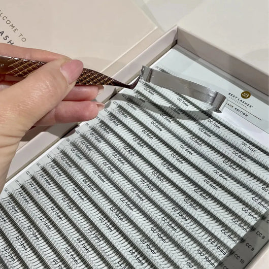 The Premade Edition’s pre-fanned lashes are made by hand, one by one, using the latest heat-sealing technique, which is why they are also called Promade lashes.