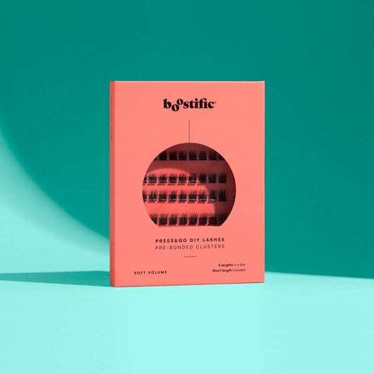The Boostific Press&Go DIY False Lashes are the perfect combination of professional lash extensions and at-home convenience. Pre-glued clusters ensure a clean, quick, and precise application—no extra adhesive needed. Once applied, they seamlessly blend with your natural lashes while creating a subtle eyeliner effect, thanks to the darker lash roots that softly frame the eyes.